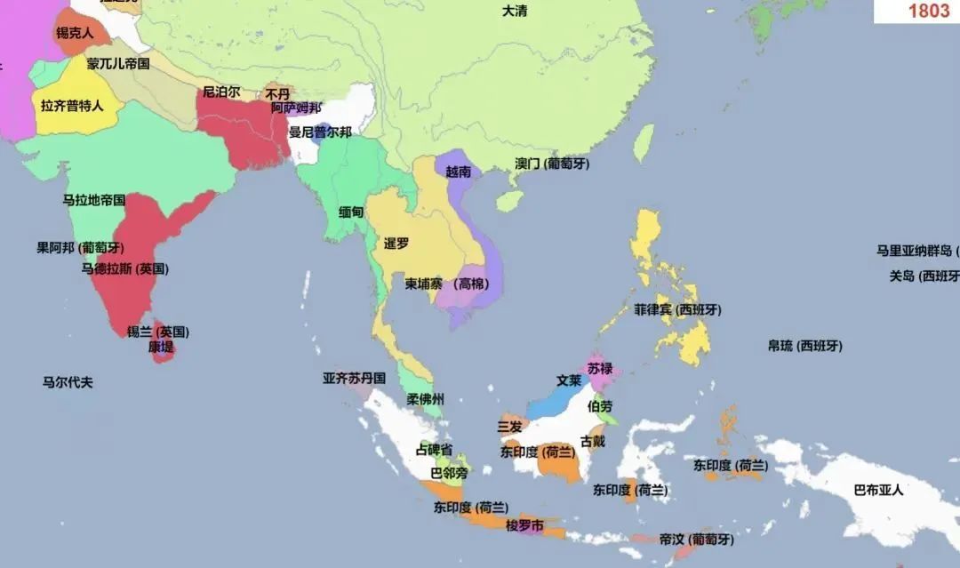到19世纪,英国以南亚为跳板入侵东南亚,相继控制缅甸、马来半岛南部和加里曼丹岛北部。