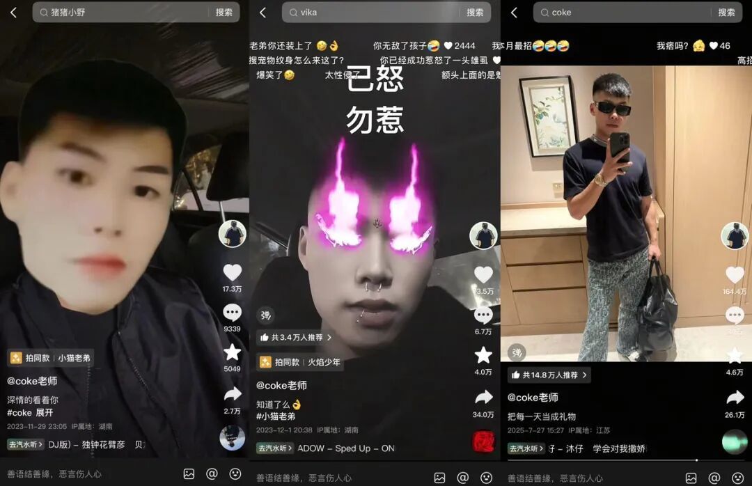 除此之外,@coke老师 的自我调侃也形成了独特的反差,激发了粉丝们的创作热情。他的“包变脸的老弟”等系列口头禅,精准切中年轻人的情感表达需求,成为他们网络交流的常用语。