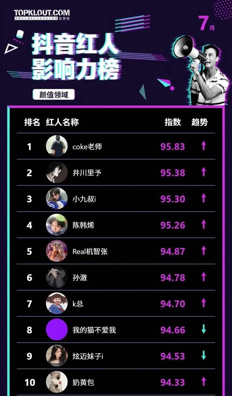 除此之外,@coke老师 长期稳居「克劳锐」发布的【抖音红人影响力榜】颜值领域TOP10。而在7月发布的榜单中,@coke老师 更成了颜值领域排名第一。