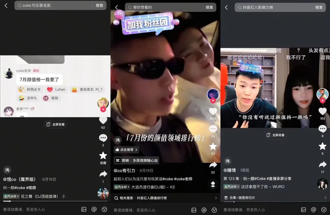 “抖一颜”这个称号的由来,是@coke老师 内容策略成功的缩影。最早是网友们把@coke老师 的一段卡点视频弹幕压缩成“抖一颜”,后来只要coke开播,弹幕就排队刷屏“抖一颜”,也慢慢成了他的外号。