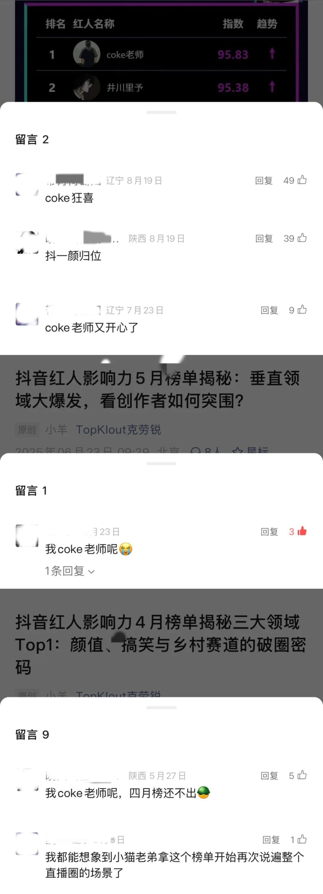 在「克劳锐」微信公众号后台,经常有粉丝留言评论为@coke老师 加油打call,甚至在他偶尔没登上【抖音红人影响力榜】的榜单时,还有粉丝主动留言关心询问原因。