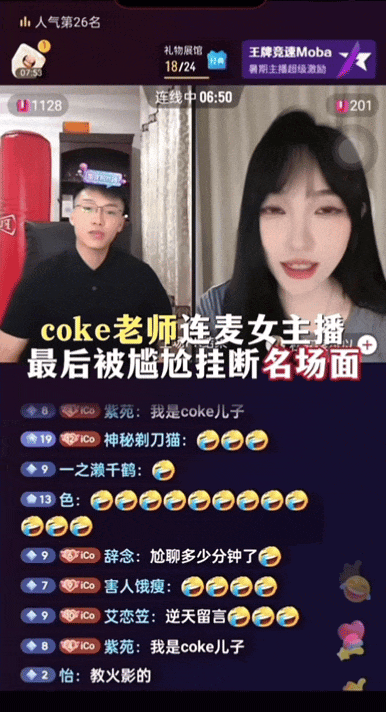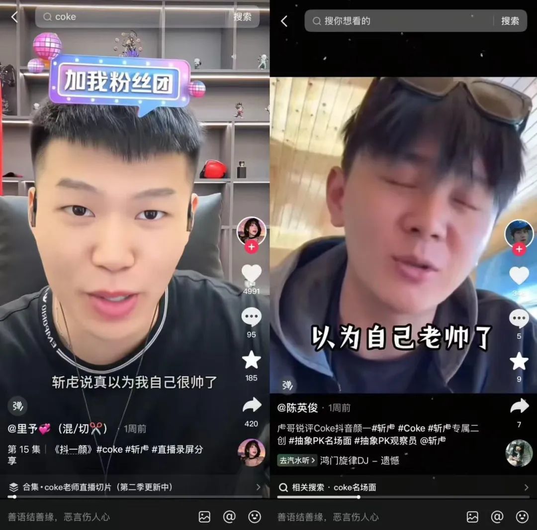 甚至@coke老师 本人都开始用这个称号来发布内容,与其他主播连麦互动,尤其是与榜单排名15的@斩虍 的互相调侃搞抽象PK。