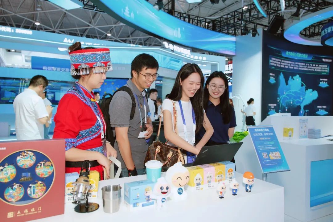 在数博会南网主展厅文创专区,丰富多样的文创产品吸引了众多展会观众驻足并积极参与有奖问答活动。(南网传媒公司 供图)