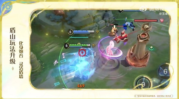 在英雄玩法调整上,盾山迎来重磅升级,可以说是辅助玩家的福音。升级之后,一技能盾山托举队友后,攻击操作优化为右摇杆蓄力瞄准;三技能释放后则会产生移动盾墙,盾山也可自由行动,从此告别原地罚站,这也将很大程度上提升盾山的灵活度,在对线和打团战的时候,作用会更大。