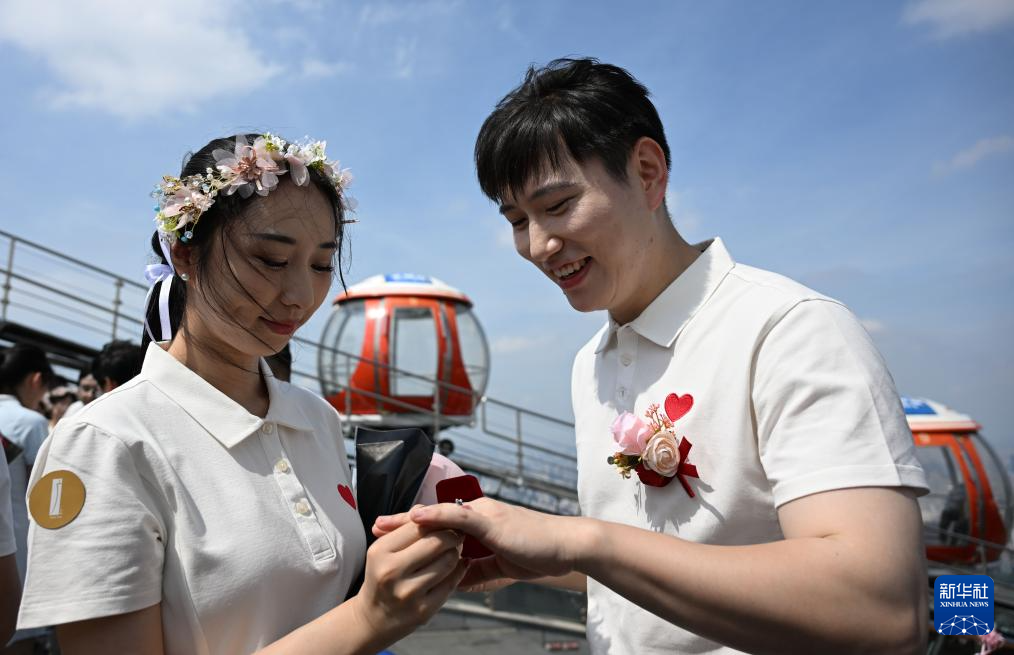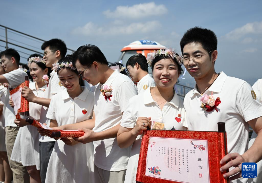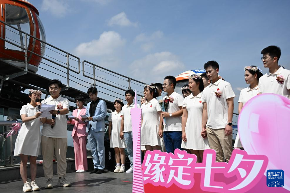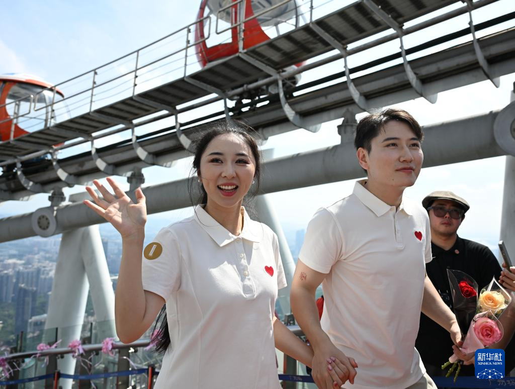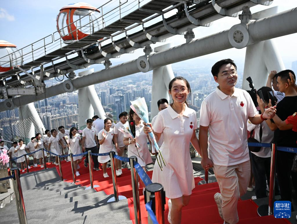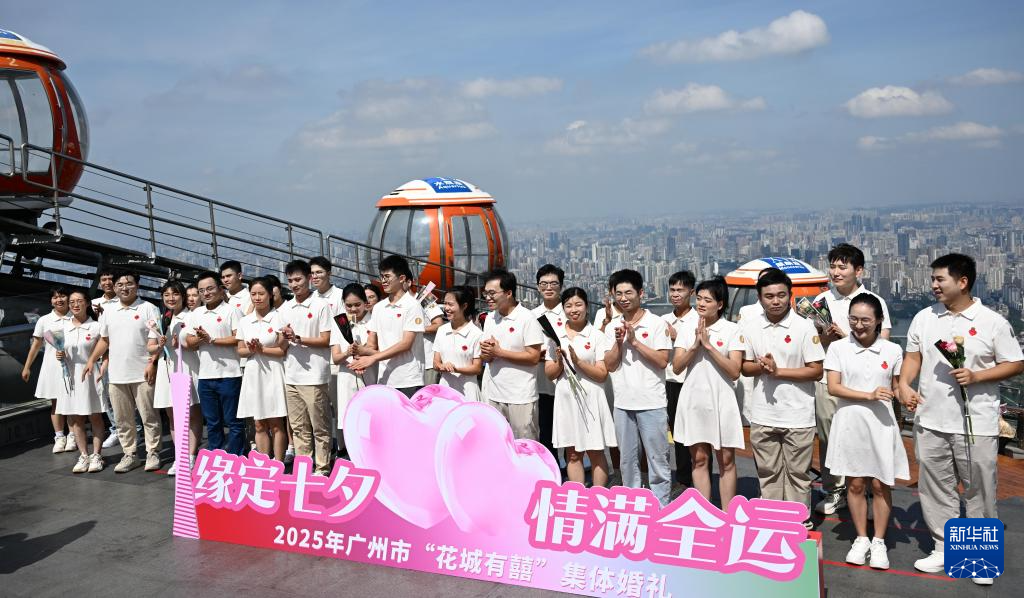 8月29日,“缘定七夕 情满全运”2025年“花城有囍”集体婚礼活动在广州塔450米户外观景平台举行,15对新人在活动中喜结连理。