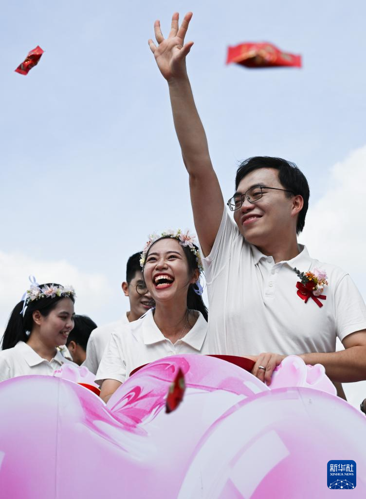 8月29日,在广州塔参加集体婚礼的新人抛撒喜糖。