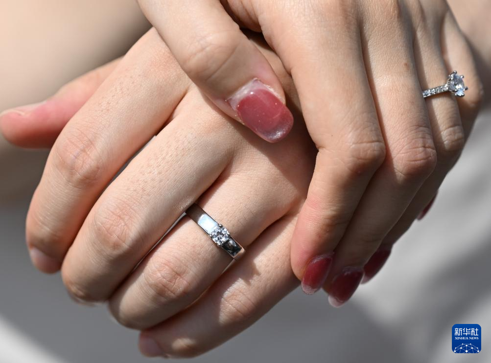 8月29日,在广州塔参加集体婚礼的新人展示婚戒。