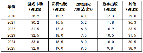 表:2020-2025年中国数字创意产业市场规模及细分领域贡献度