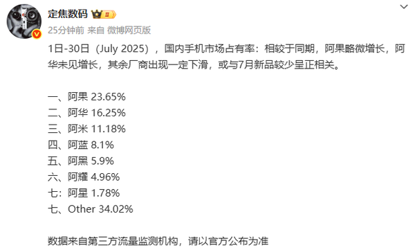 2025年7月,中国智能手机市场出货量格局出现显著变化。根据第三方流量监测机构发布的最新数据显示,当月国内手机市场占有率排名中,苹果以23.65%的份额位居第一,华为以16.25%排名第二,小米位列第三,市占率为11.18%。vivo、OPPO和荣耀分别以8.1%、5.9%和4.96%的份额紧随其后。三星占比1.78%,其他品牌合计占据34.02%的市场份额。