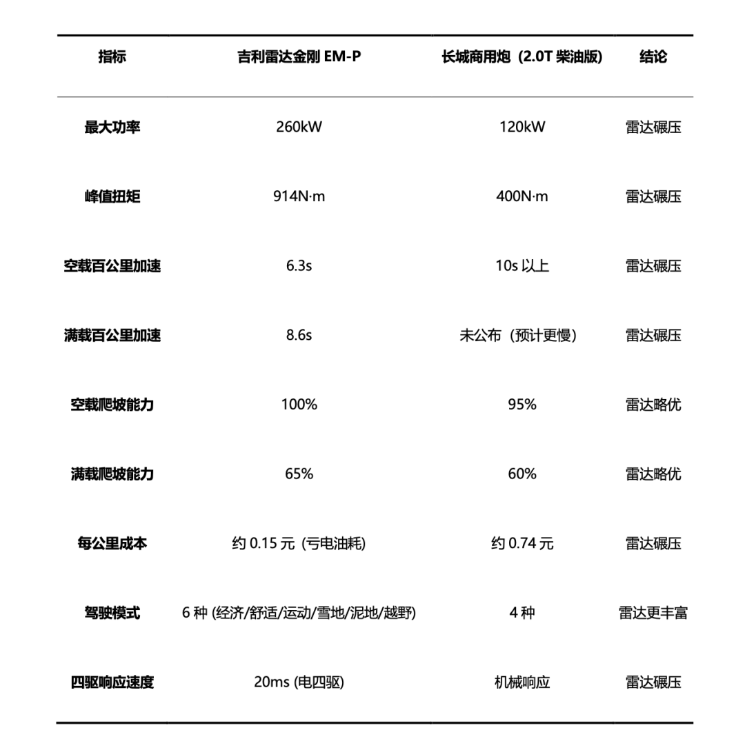 至于可靠性跟耐久性,现在还是个薛定谔命题,你肯定不能期望眼下吉利雷达可以在这些硬核指标上看齐老炮,比如福特游骑侠Ranger或者五十铃D-MAX,毕竟不管地平线还是金刚,三电系统在长期、高强度、多尘、多湿、多振动的越野环境下究竟有多耐用依然是个未知数。