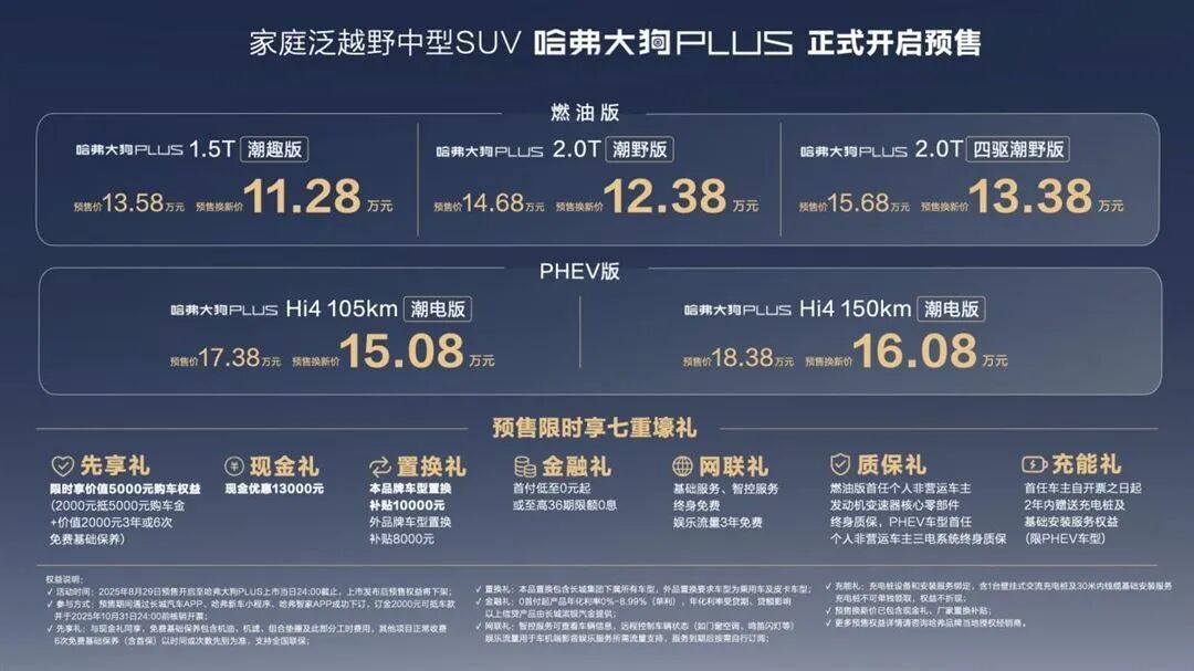 8月29日,成都车展上哈弗大狗PLUS正式公布了预售价格,共推出5款配置,预售价区间为13.58-18.38万元,预售焕新价区间为11.28-16.08万。哈弗大狗PLUS作为二代大狗的改款车型,将于哈弗品牌的哈弗猛龙2026款、二代哈弗枭龙MAX共同构建出Hi4 技术车型的“全场景拼图”。