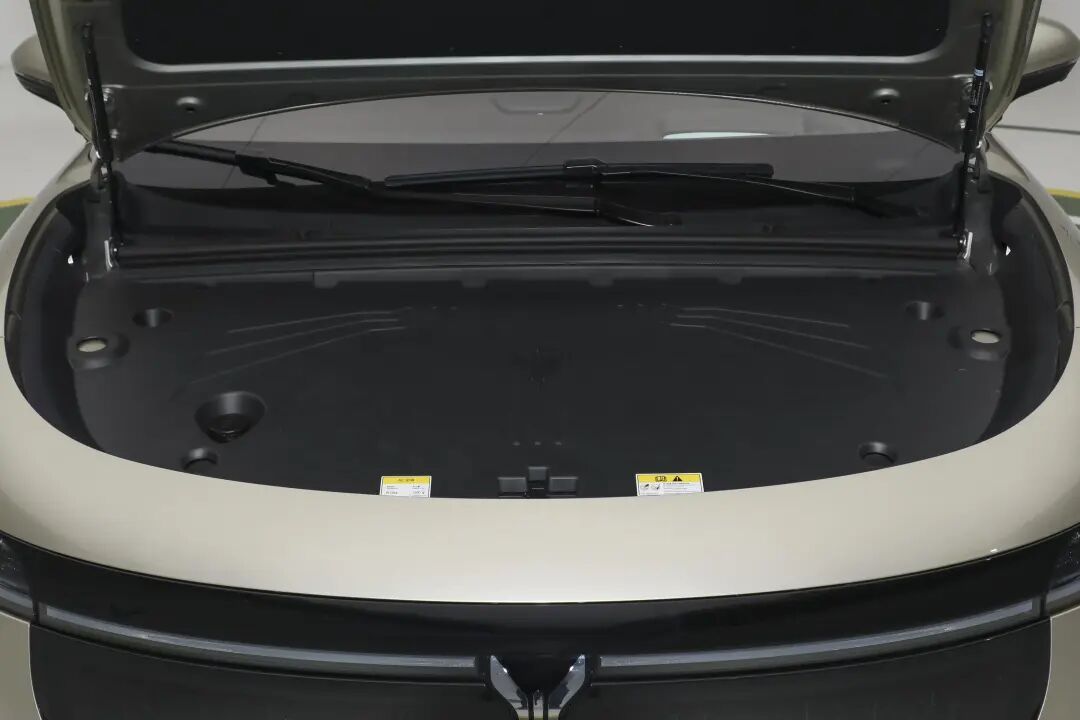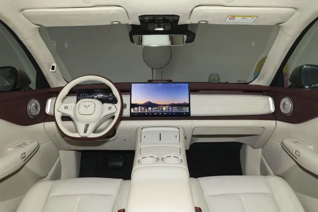 内饰方面也是比较简洁的风格,提供有三幅式多功能方向盘、悬浮式全液晶仪表盘、悬浮式中控屏以及电子怀挡,操作台部分设计有无线充电面板以及杯架,中控运行的是鸿蒙座舱HarmonySpace 5系统,搭配的是高通骁龙8295芯片,功能性和流畅度都有出色的表现。