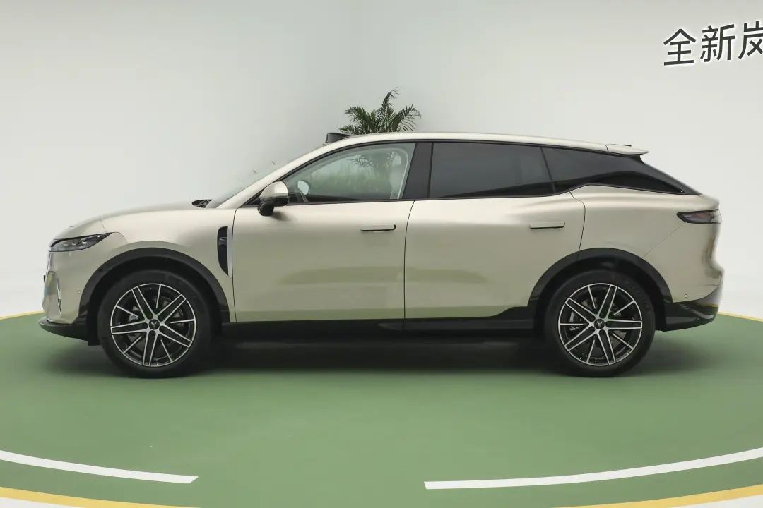 侧面造型方面,车顶带着明显的弧度,而且营造出了悬浮式车顶,带来了比较时尚的视觉效果;腰线采用了分段式设计,点缀出了车身侧面的层次感;门把手则是弹出式设计,能够起到降低风阻的作用;轮眉和侧裙部分设计有粗壮的黑色饰板,带来了一定的力量感;轮毂则是双五辐式造型,风格还算简洁。