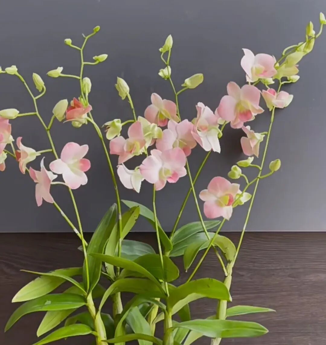 秋石斛的每一根杆子生长成熟后,都会开一次花,在植株的顶端从叶子之间抽出花剑。养护得当,一个杆子可以开两三个以上的花剑。