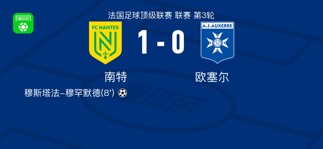 北京时间8月31日法国足球顶级联赛 联赛 第3轮,南特主场对阵欧塞尔。南特穆斯塔法-穆罕默德破门。最终比分南特 1-0 欧塞尔。