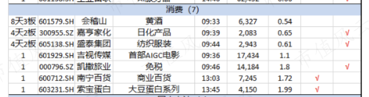 此外,周五科技线调整,从里面出来的资金满市场找机会,于是周五宁王带领固态起来了,茅台带领消费起来了。但消费里的白酒持续性并不高,反而是南宁百货、凯撒旅业、国光连锁这类经常涨停的票,只要给个机会就容易上板,可以观察。