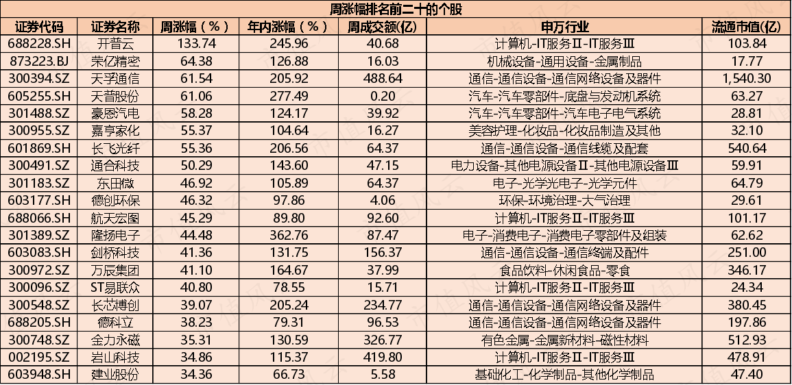本周个股涨幅方面也是表现强者恒强,年内涨幅没翻倍的个股基本上登不上本周涨幅的榜单,像开普云、天孚通信、天普股份、长飞光纤、长芯博创年内涨幅已超200%。