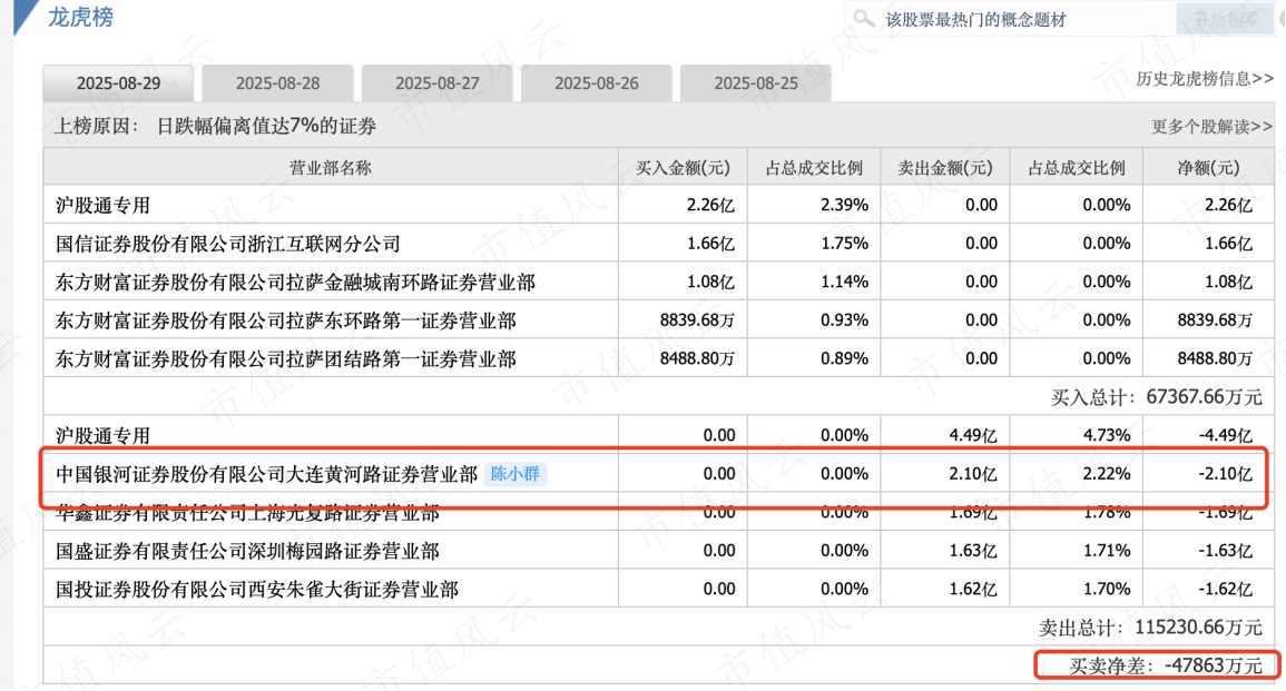 而像华胜天成、万通发展、天融信就属于游资的抱团容量票,陈小群周内玩了五天华胜天成,虽然周五负反馈严重最后封死跌停,但早在27号他已经开始边打边撤,到了周五单边出货2.1亿。