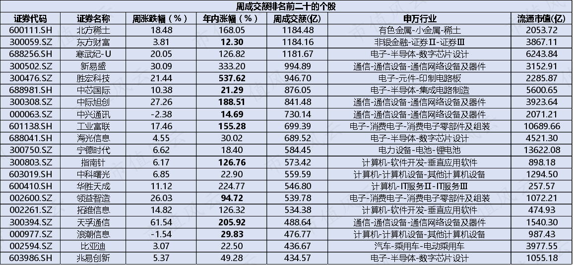 从周成交额来看,大盘已被科技绑架,前二十中有16只个股来自于电子、通信、计算机,从如此大量的筹码交换这点来看,科技大票大多还是在走加速,即使后续想出货,行情也会反复。