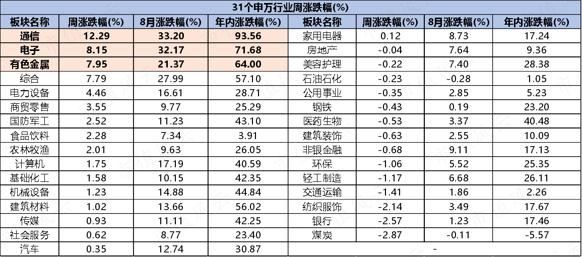 本周,31个申万行业表现严重分化,科技板块强者恒强,通信、电子分别大涨12.29%和8.15%,尤其通信板块在机构的努力下,年内涨幅已接近翻倍。另外,周内活跃度比较高的还有稀土,带动有色板块涨近8%。