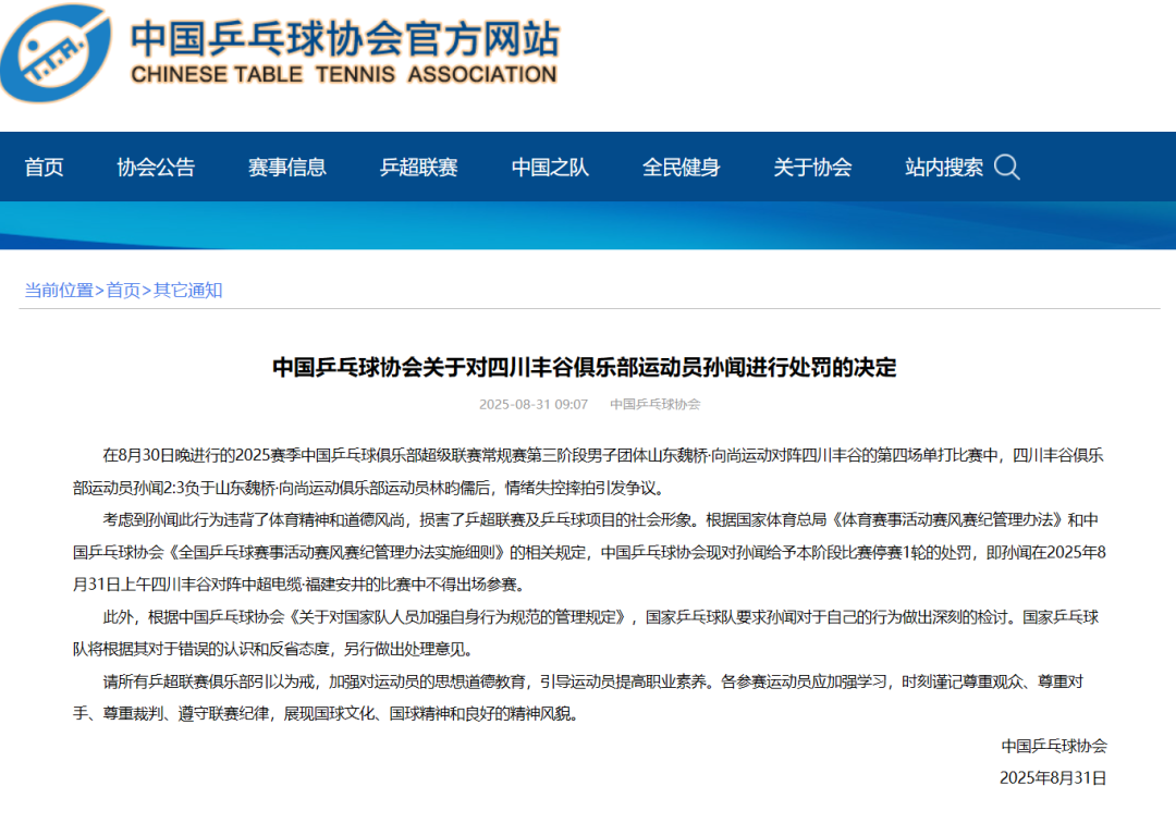 考虑到孙闻此行为违背了体育精神和道德风尚,损害了乒超联赛及乒乓球项目的社会形象。根据国家体育总局《体育赛事活动赛风赛纪管理办法》和中国乒乓球协会《全国乒乓球赛事活动赛风赛纪管理办法实施细则》的相关规定,中国乒乓球协会现对孙闻给予本阶段比赛停赛1轮的处罚,即孙闻在2025年8月31日上午四川丰谷对阵中超电缆·福建安井的比赛中不得出场参赛。