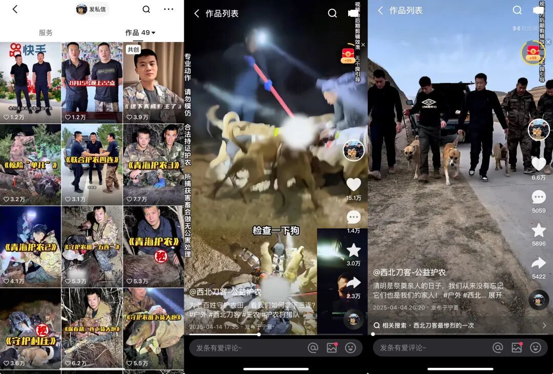 例如,三农护农品类的突出代表@西北刀客-公益护农 ,他们有着一支训练有素的“汪汪队”,不仅借助短视频分享猎犬的日常以及抓捕的精彩瞬间,还通过直播实时跟拍抓捕野猪、守护庄稼的过程。