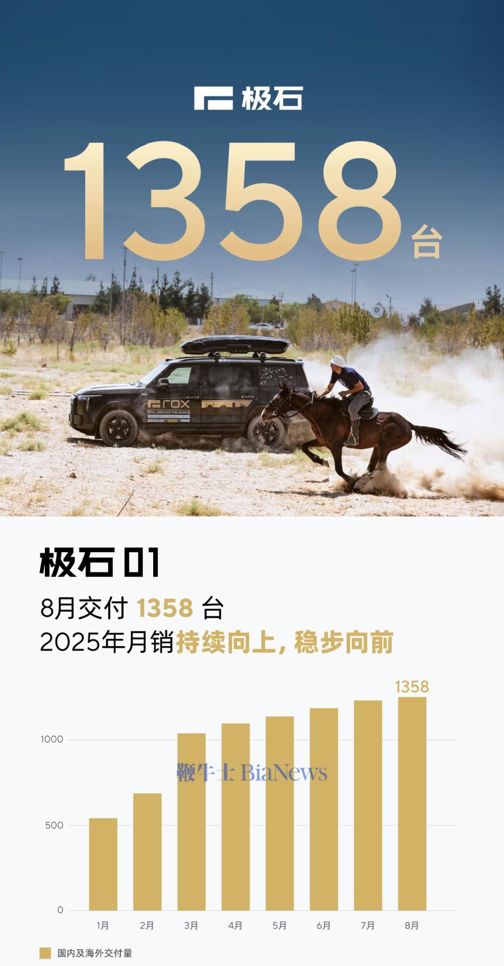 8月31日,极石汽车公布最新交付数据,8月共交付1358台车,官方称“2025年月销持续向上,稳步向前”。