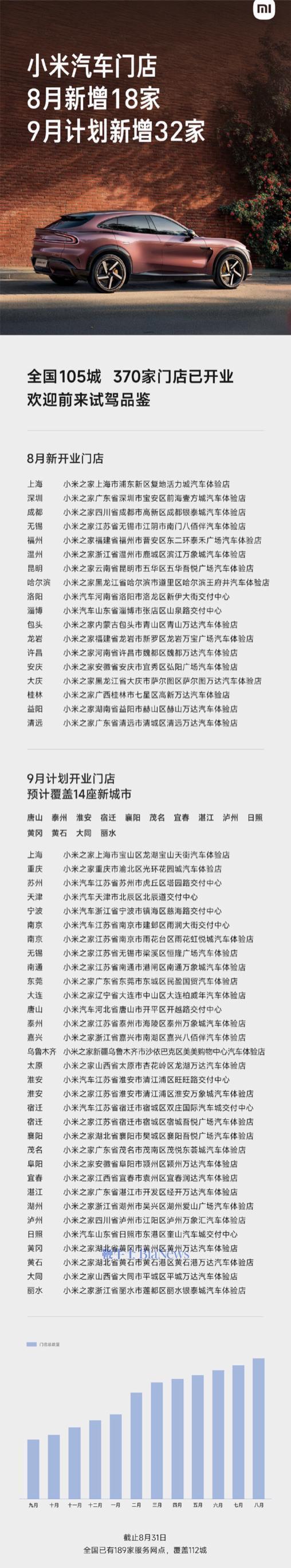 8月31日,小米汽车官方公布最新开店进展。8月新增18家门店,全国105城已有370家门店。9月计划新增32家门店,预计覆盖唐山、泰州等14座城市。