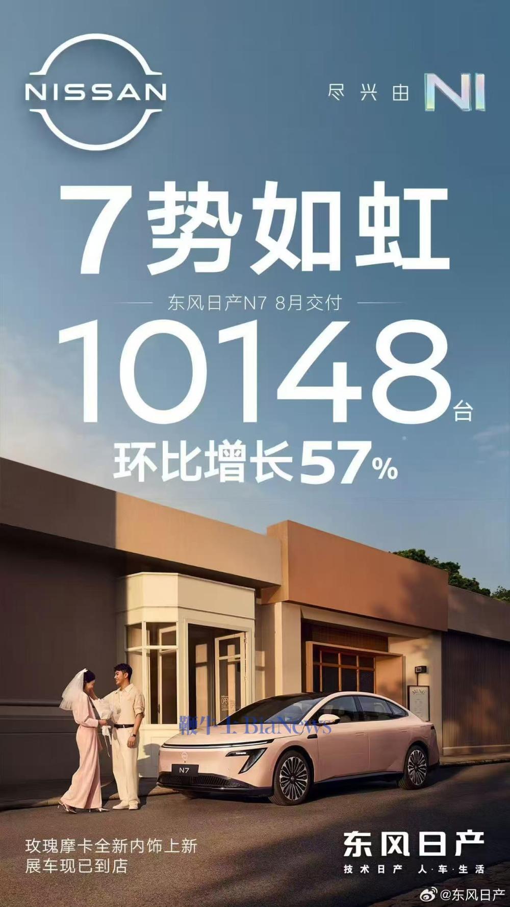 9月1日,东风日产官方宣布N7销量,8月交付10148台,环比增长57%。
