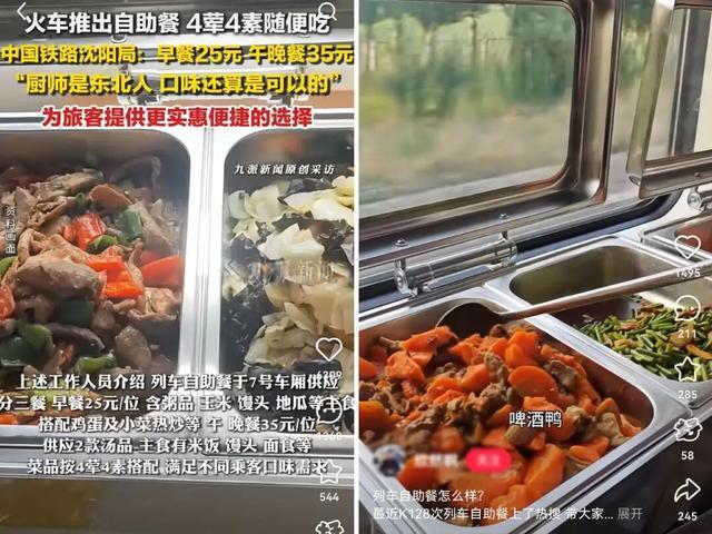 九派新闻报道,国铁沈阳局推出的列车自助餐出圈,早餐25元,午晚餐35元,四荤四素随便吃,而且是东北大厨现炒。据中国铁路沈阳局集团有限公司工作人员称“列车自助餐自5月份试点推行,7月正式推出。”网友们纷纷喊话推行自助餐,封面新闻8月27日报道,目前国铁成都局管内列车上暂未推出自助餐,不过旅客在车上一般都能点到平价盒饭,最低15元。