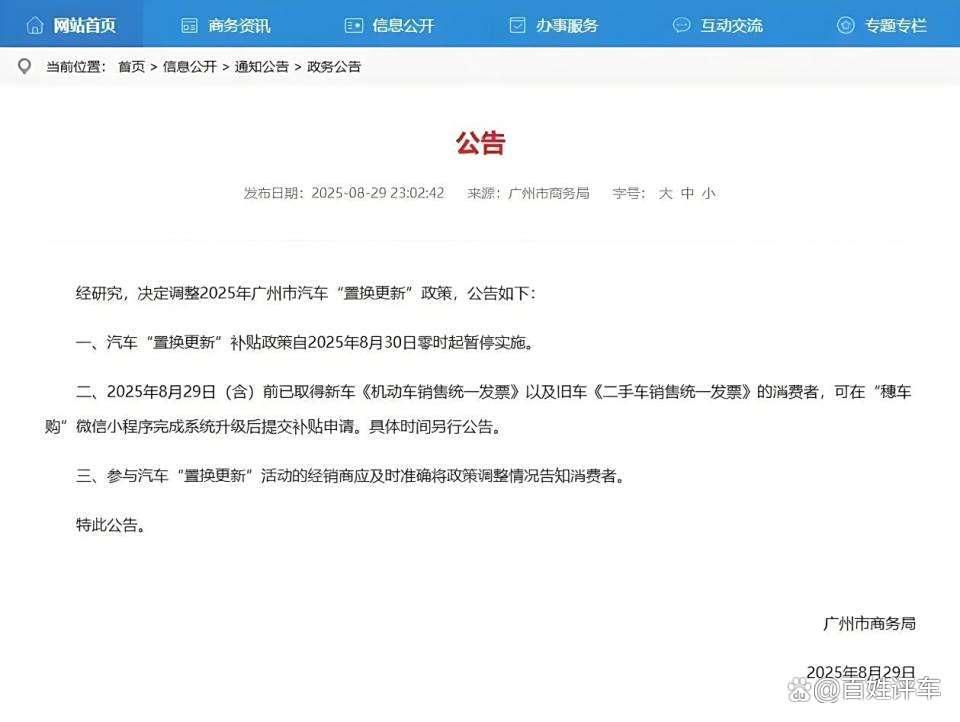 日前,广州市商务局发布公告,决定自2025年8月30日零时起暂停实施汽车“置换更新”补贴政策。这意味着此后购买新车的消费者将无法再享受相应的补贴优惠。在2025年8月29日(含)之前已取得新车《机动车销售统一发票》及旧车《二手车销售统一发票》的消费者,仍可在“穗车购”微信小程序完成系统升级后,按后续公告指引提交补贴申请。