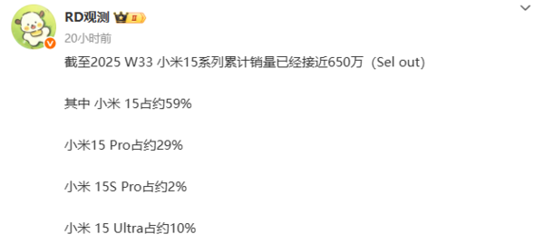 近日,有数码博主曝光了小米15系列的销量情况。该博主称,截至2025 第33周,小米15系列累计销量已接近650万台。其中,小米15占比约59%、15 Pro占比约29%、15S Pro占比约2%、15 Ultra占比约10%。