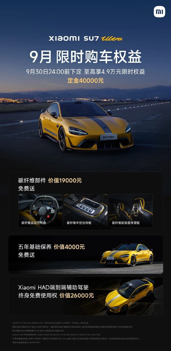 刚刚,雷军公布小米汽车 9 月限时购车权益,覆盖 YU7、SU7、SU7 Ultra 三款车型,核心权益均包含辅助驾驶终身免费使用权,权益需在 2025 年 9 月 30 日 24:00 前下定并支付对应定金方可享受,具体细则如下: