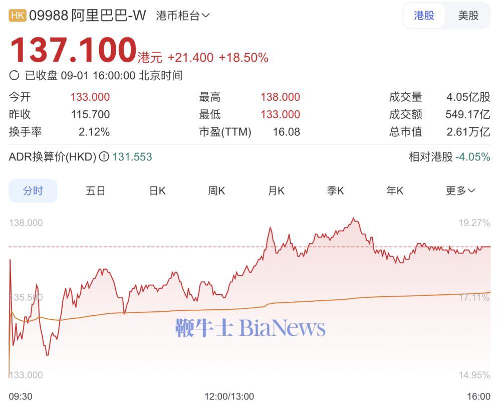 9月1日,阿里巴巴港股收盘暴涨18.5%,股价报137.1港元/股,总市值2.61万亿。
