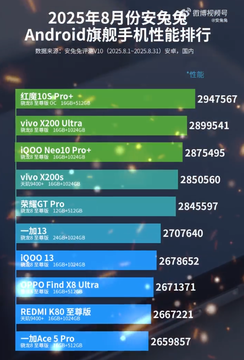 榜单显示,红魔10S Pro+以2947567分强势登顶。vivo X200 Ultra以2899541分的成绩位列第二。iQOO Neo10 Pro+排名榜单第三,拥有2875495分的成绩。vivo X200s和荣耀GT Pro分别以2850560分和2845597分的成绩位居四、五名。一加13和iQOO 13分别以2707640分和2678652分的成绩排名第六、七名。OPPO Find X8 Ultra、REDMI K80至尊版和一加Ace5 Pro分别占据榜单第八、九、十名。