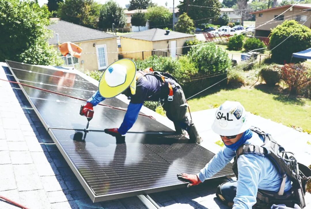 ▲图为美国加利福尼亚的工人正在安装屋顶光伏板。