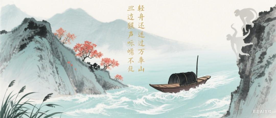 文字可以反映图片生成的效果,提示词是生成「两岸猿声啼不住,轻舟已过万重山」的海报