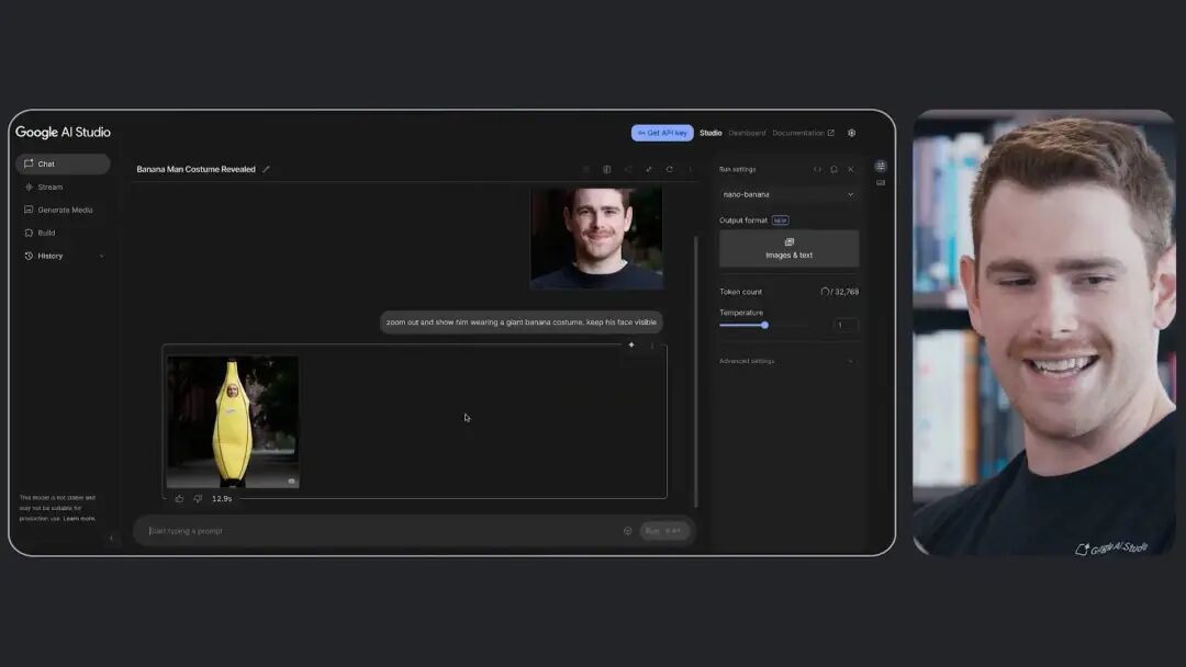 Nicole:好,我来给你拍一张照片吧。我们先从一个简单的例子开始:比如「拉远镜头,给他穿上一套巨大的香蕉服装,但保持脸部清晰,因为要保证看起来还是你」。生成需要几秒钟,但还是很快的,你们记得上一次发布的模型就已经很快了。