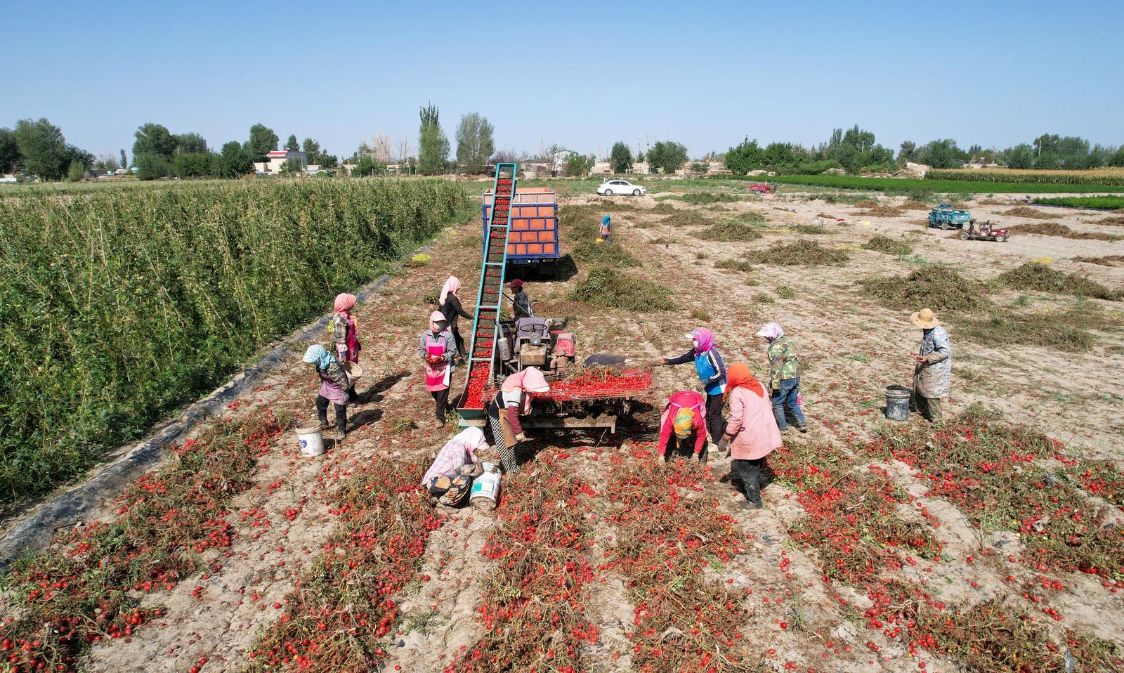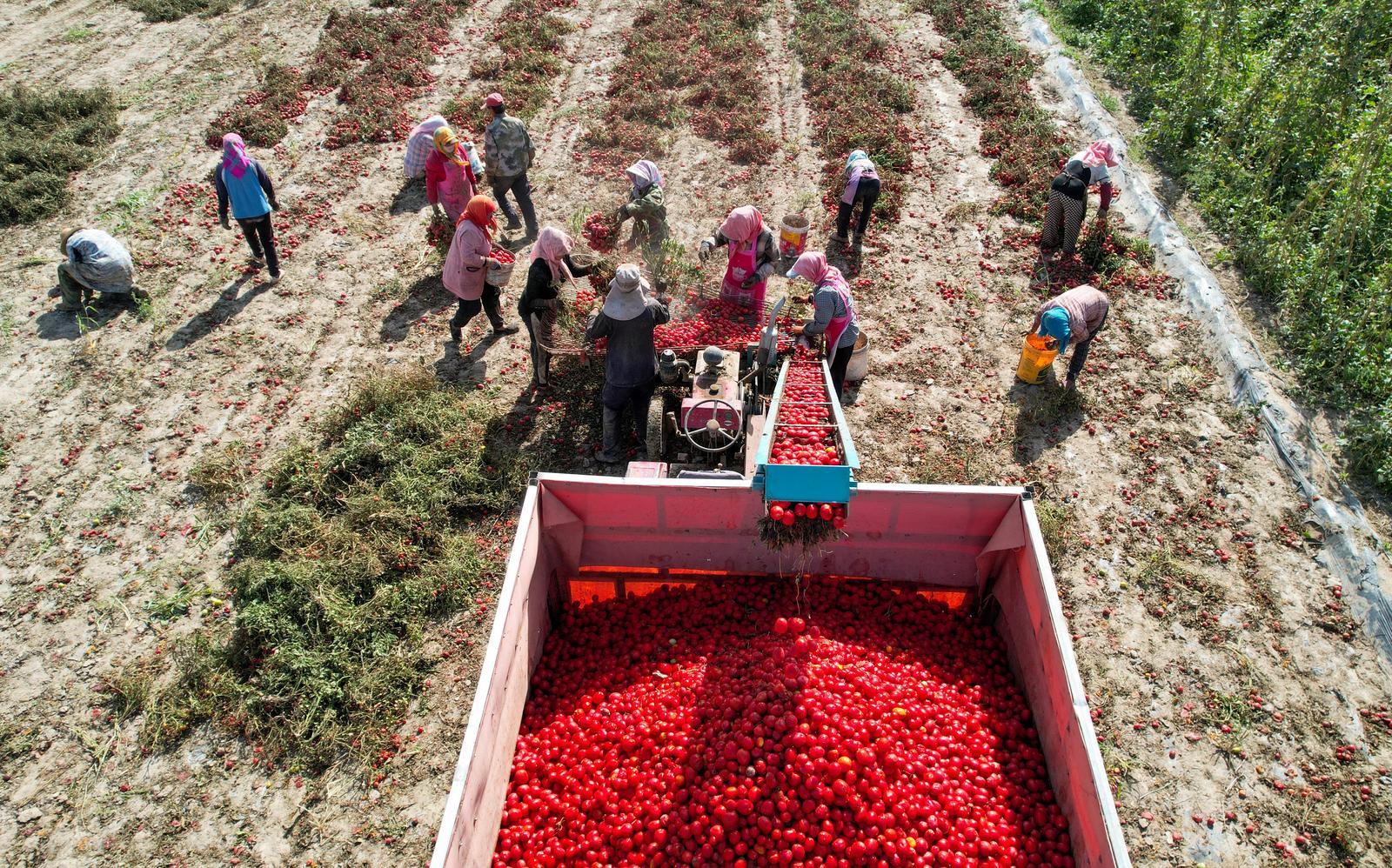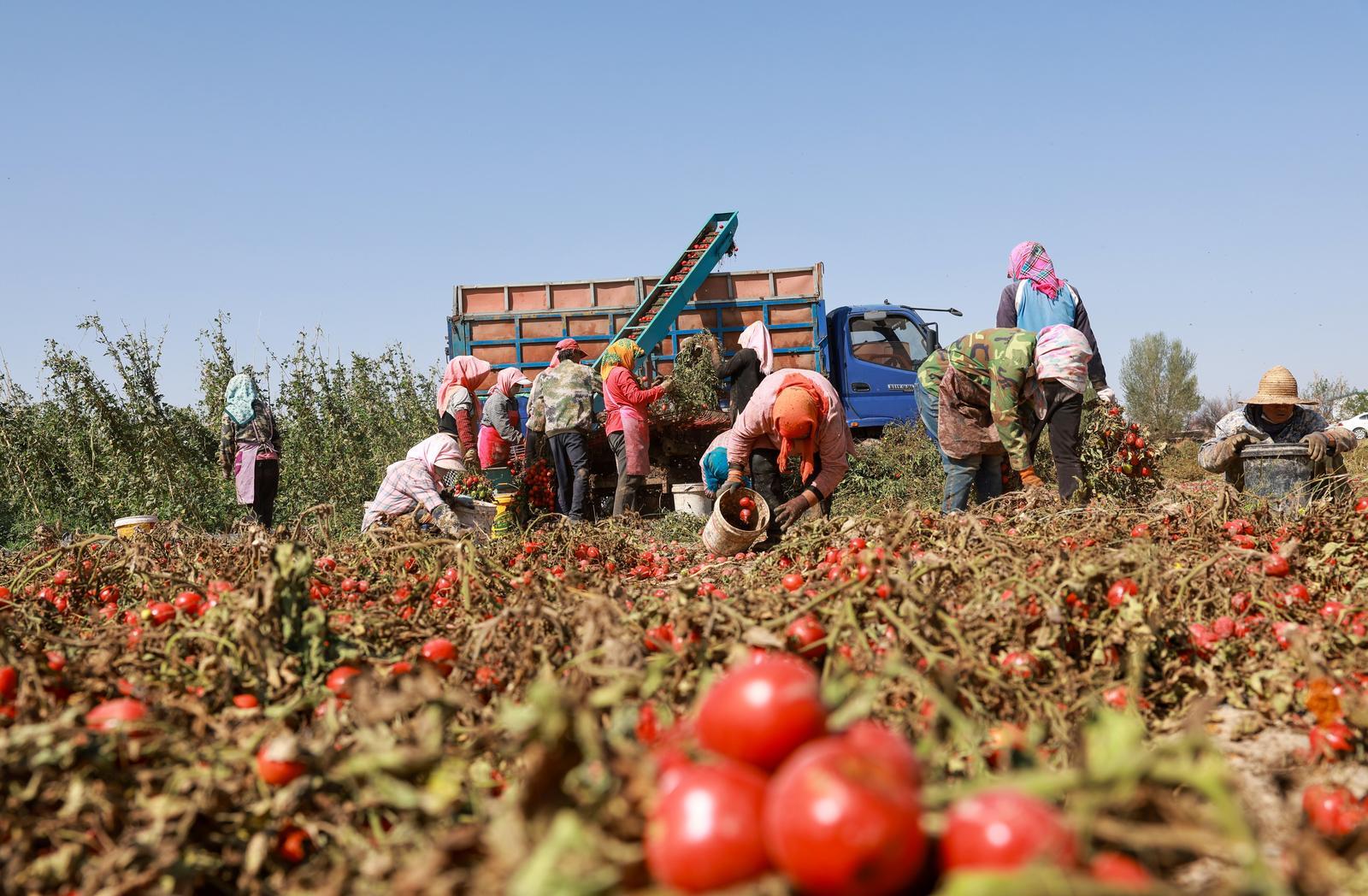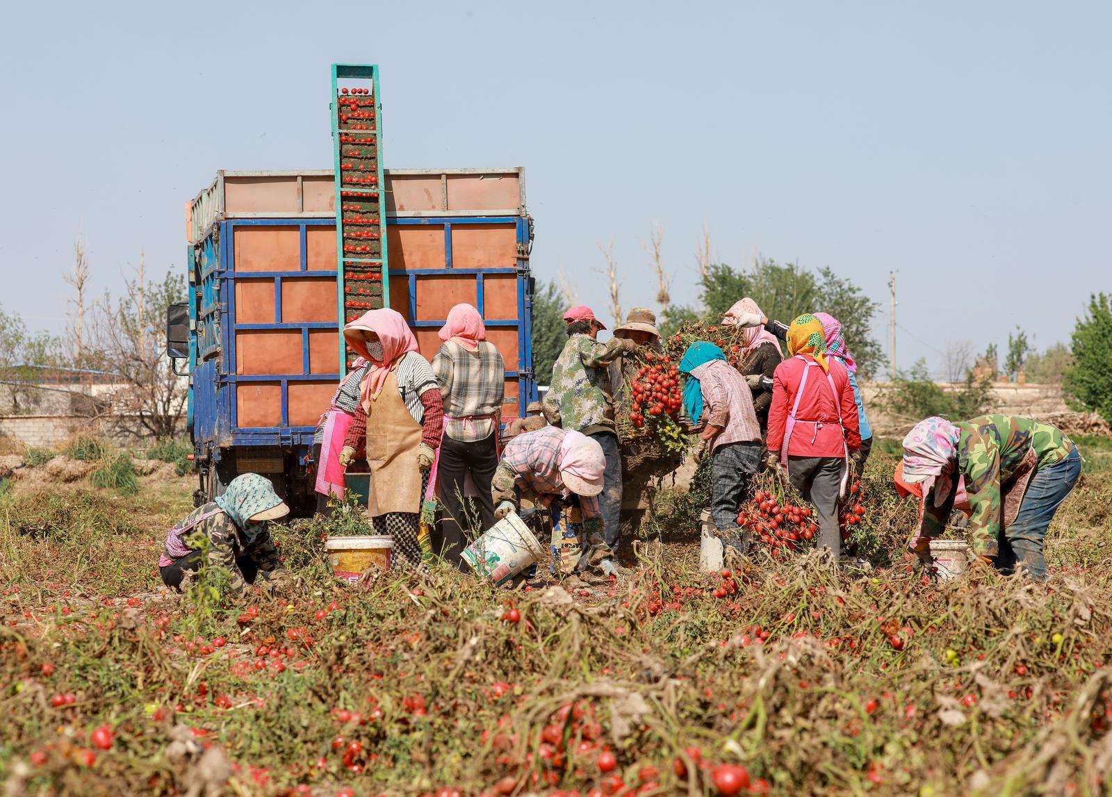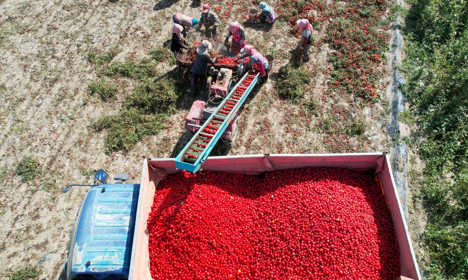 8月31日,金塔县金塔镇边沟村番茄迎来成熟季,鲜红的番茄挂满枝头,种植户们正抢抓农时,忙着采收、分拣、装车,呈现出一派繁忙的丰收景象。