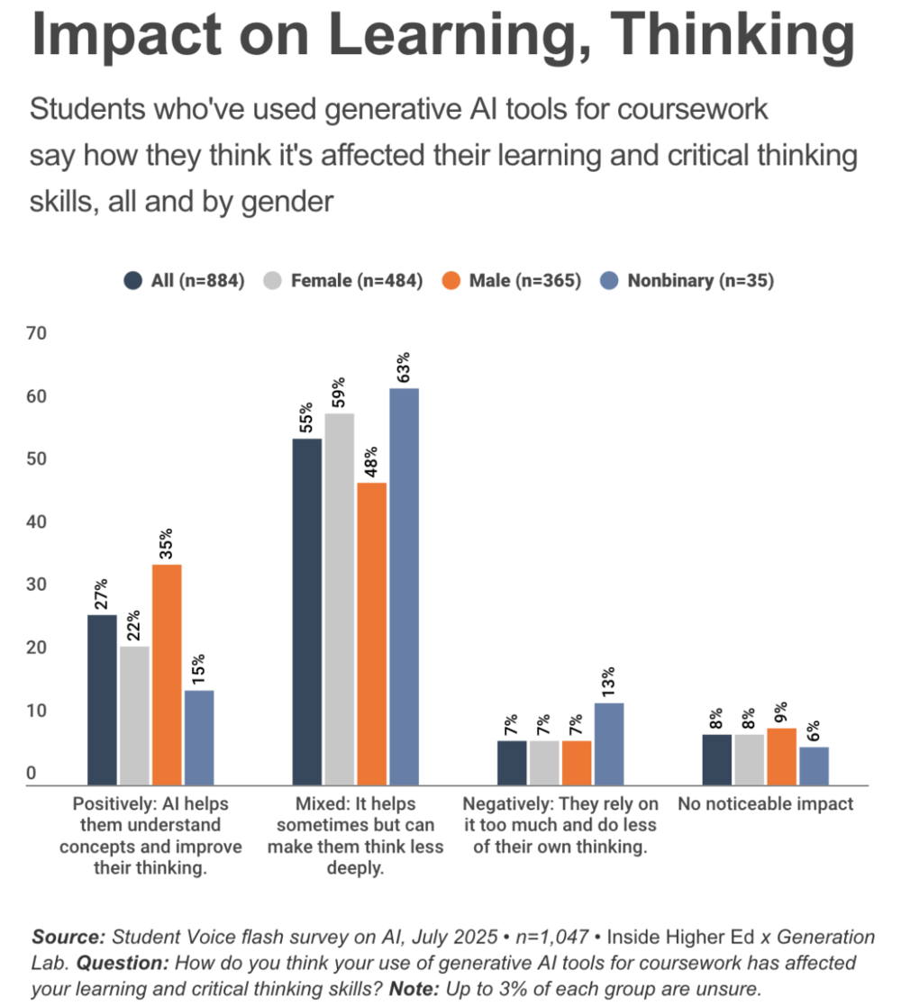 在过去一年使用AI辅助课业的学生中,55%认为AI对学习能力和批判性思维好坏参半:既提供帮助又可能削弱深度思考。