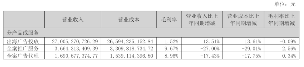 蓝色光标2025年上半年全案推广服务收入为36.64亿元,较上年同期下降27%;全案广告代理收入为16.9亿元,较上年同期下降17.43%。