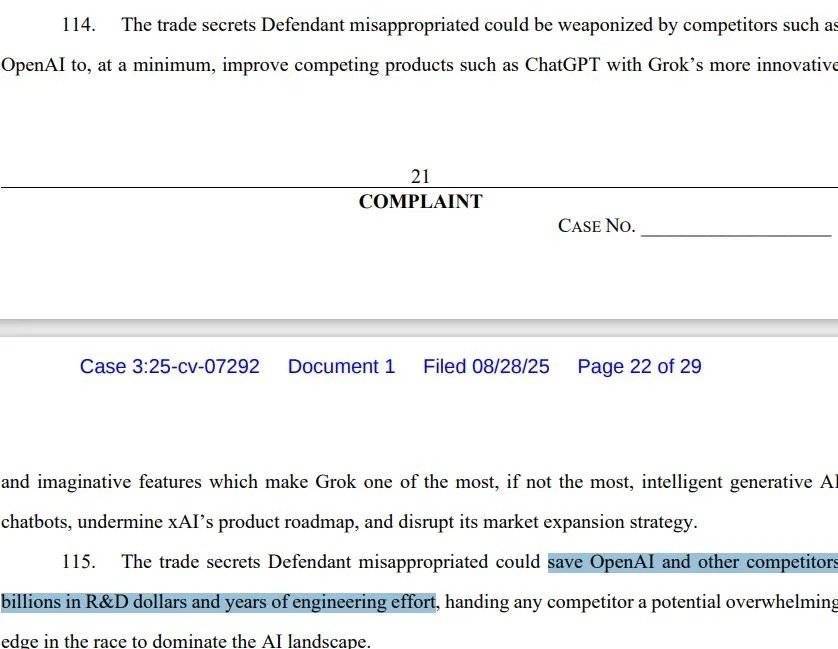 在AI模型开发动辄耗资数亿美元的今天,这份代码库的分量可想而知。xAI在起诉书中称,这些被盗的技术都是“功能优于ChatGPT和其他竞品的尖端人工智能技术”。