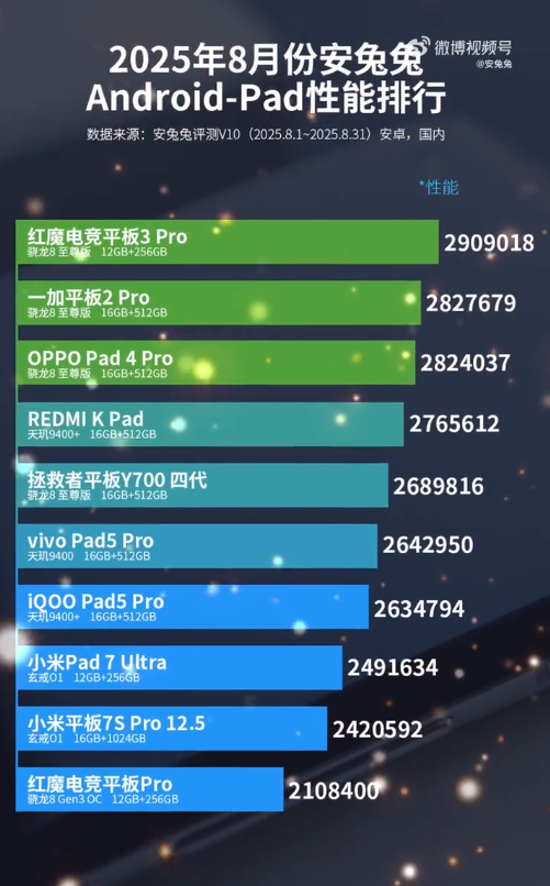【CNMO科技消息】9月3日,安兔兔发布了8月安卓平板性能榜。榜单显示,红米REDMI K Pad以2765612分的成绩排名榜单第四名。