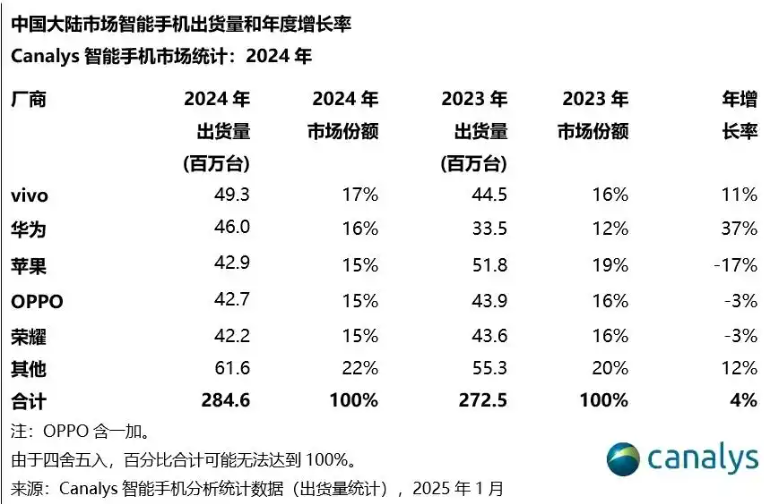 Canalys的数据显示,2024年中国智能手机出货量中,苹果的市场份额排名第三,出货量同比下降17%,仅为4290万部,不及vivo和华为。