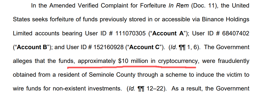法院文件显示,三个遭法院冻结的币安账户里面有价值大约1000万美元(约合人民币7143万元)的加密货币。