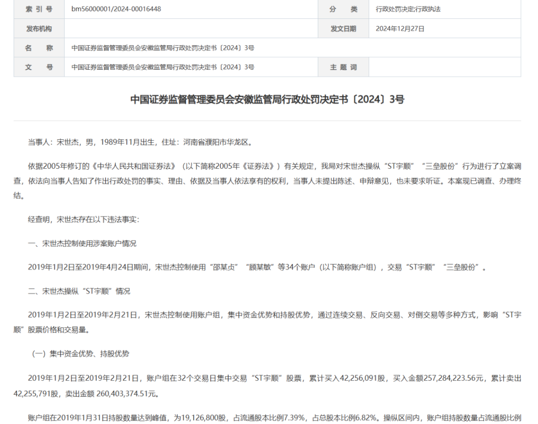 2024年12月,安徽证监局下达行政处罚决定,没收宋世杰违法所得1114万元,并处以同额罚款,总计逾2200万元。