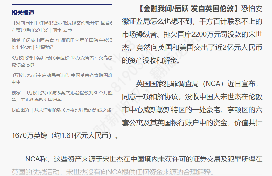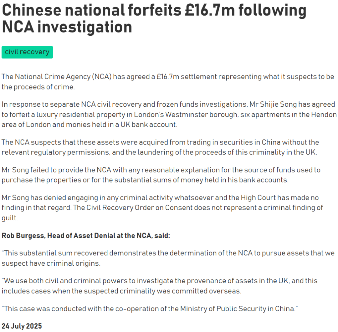 NCA怀疑这些资产系通过在中国未经相关监管许可进行证券交易所得,并在英国进行了洗钱。