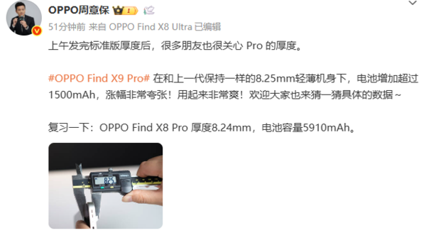 9月4日,OPPO Find系列产品负责人周意保发文透露Find X9 Pro的机身厚度和电池容量。他表示,新机在和上一代保持一样的8.25mm轻薄机身下,电池增加超过1500mAh。
