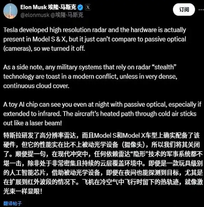 特斯拉的车型到目前为止一直采用纯视觉方案,靠8个摄像头完成对环境的感知。其实在2021年的时候就有人提问马斯克为什么不考虑激光雷达的相关方案。马斯克倒也直白,称Model S/X曾搭载过自研高分辨率雷达,但实测性能“远不及被动光学”,遂彻底停用。简单说就是尝试过,不好用,放弃。
