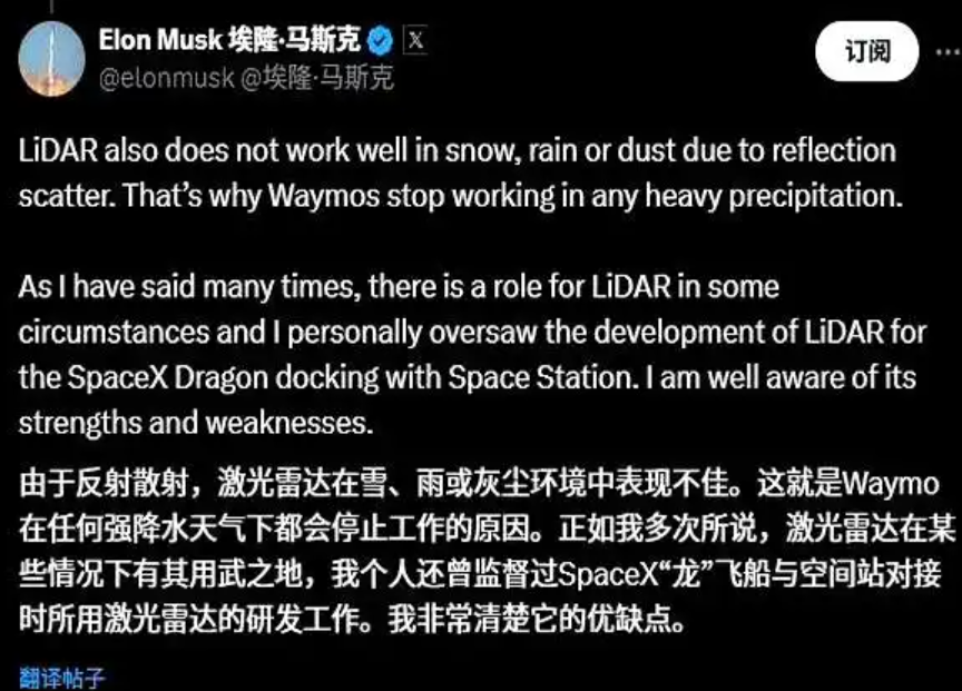 马斯克称Waymo的自动驾驶激光雷达方案在恶劣天气条件下,如降雪、降雨甚至沙尘暴等场景中,激光雷达会陷入导航困境。并表示:“受反射散射影响,激光雷达在雪、雨或沙尘环境下表现糟糕,这也是Waymo在强降水天气里完全无法行驶的原因。”